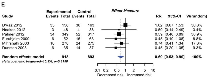 研究发现,母亲孕晚期和哺乳期(从孕36-38周到哺乳期最初的3-6个月)服用益生菌,则子代4岁内发生湿疹的风险显著降低22%(RR=0.78; 95% CI:0.68–0.90,P=0.0002), 如图1所示(原文Figure 4A);母亲孕期和哺乳期(从孕20周到哺乳期最初的3-4个月)补充鱼油,子代1岁内发生鸡蛋过敏的风险可能降低31%(RR=0.69, 95% CI:0.53–0.90),见图2(原文Figure 7E)。