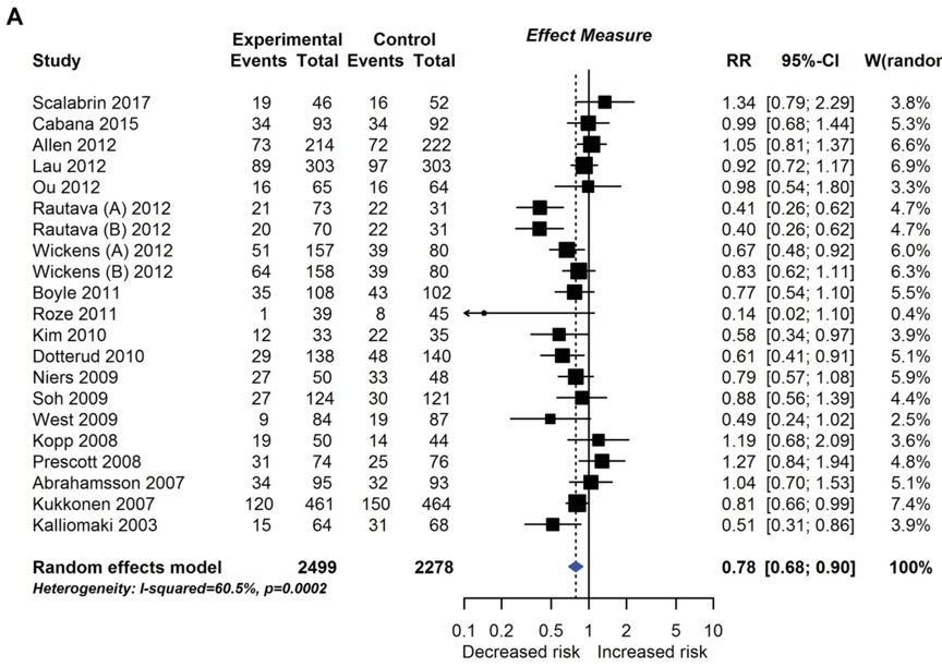 Fig 4. RCT findings for probiotic supplementation compared with no probiotics and risk of eczema (A) or atopic eczema (B) at age ≤4 years. CI, confidence interval; RCT, randomised controlled trial; RR, risk ratio; W, weight.