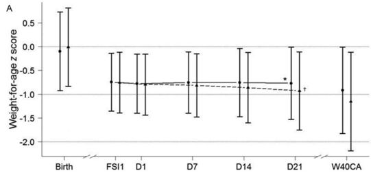 Rigo J等 [9]研究发现,强化蛋白质的母乳促进早产儿体重的增长。研究纳入法国、比利时、德国、瑞士和意大利的11家医院的新生儿重症监护病房(NICU)的胎龄≤32周或出生体重≤1500克的新生儿153例,且母亲在21天的试验期内同意挤出或捐献母乳。受试新生儿随机接受添加了新型母乳强化剂(nHMF,n=77)或对照母乳强化剂(cHMF,n=76)的早产儿母乳喂养至少21天。每100 ml母乳nHMF和cHMF增加的热量相似,均为17 kcal;增加的蛋白质则不同,分别为1.4克和1.0克。研究者发现,两组婴儿第21天(D21)相比第1天(D1)的校正后平均日增重差异为2.3克(95%CI 0.4-4.2克),nHMF组非劣效于(P<0.001)且优于cHMF组(P=0.01)。年龄别体重指数图(图1)显示,nHMF组婴儿Z评分(实线)基本稳定,而cHMF组婴儿Z评分(虚线)则随时间呈下滑趋势,D21的nHMF组婴儿Z评分显著高于cHMF组。