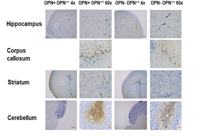 图2. OPN+/OPN++ ,OPN-/OPN++组小鼠大脑不同区域髓鞘相关基因表达情况的比较[13]