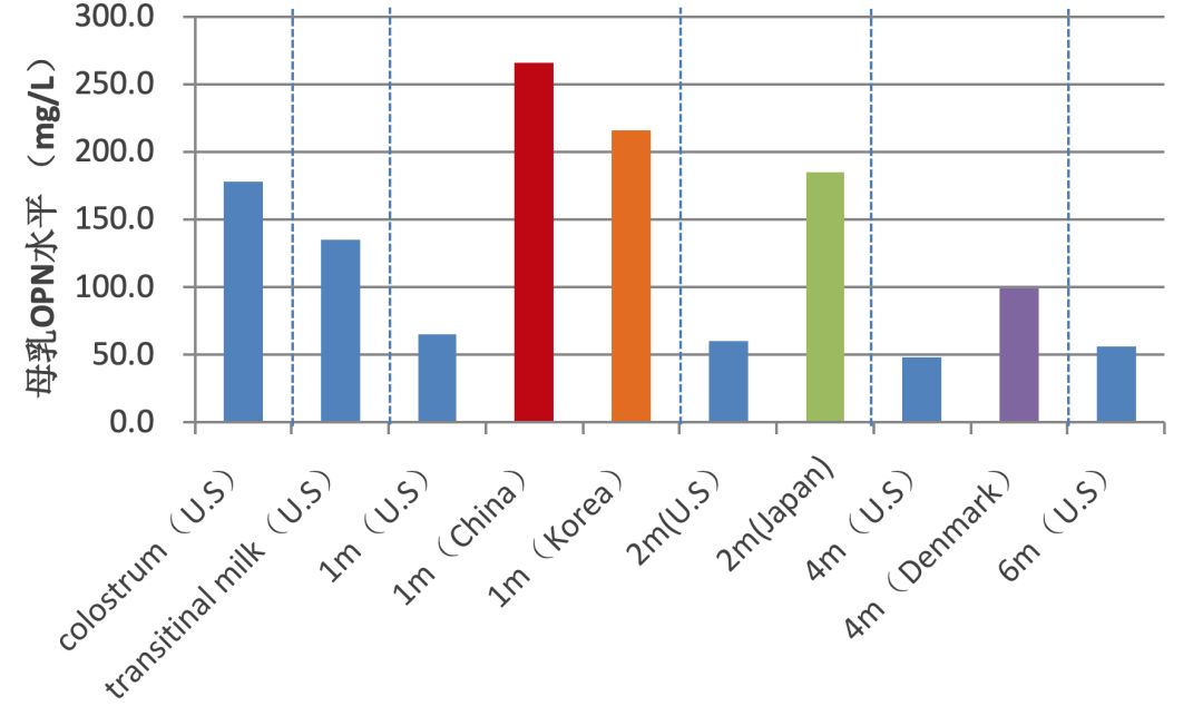 图1.不同国家不同泌乳周期母乳中OPN水平的比较[5]