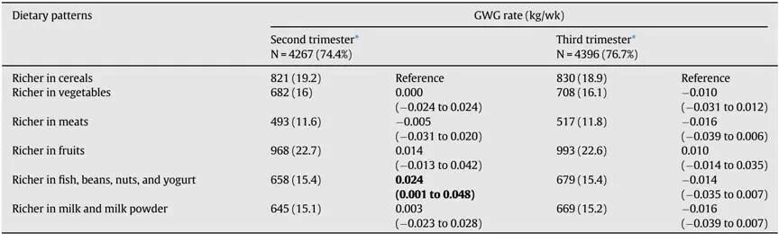 与膳食模式“以谷类为主”的孕妇相比,“以鱼/豆类/坚果/酸奶为主”的孕妇在孕中期增重过快(校正后β:0.024,95%CI:0.001-0.048,P<0.05),见表2。