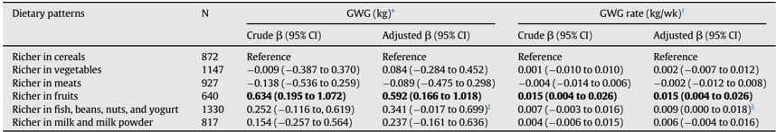Table 1. Associations between six dietary patterns and gestational weight gain
