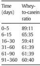 图3. 不同泌乳时期的乳清蛋白/酪蛋白比值[2]