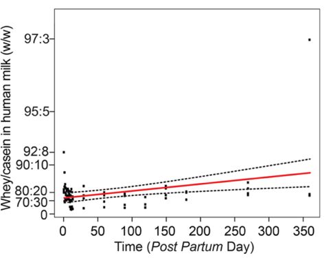 Liao Y等[2]的研究则显示,乳清蛋白和酪蛋白的比值范围从45∶55到97∶3,平均值为79∶21,中位值为77∶23。线性回归显示,母乳中乳清蛋白和酪蛋白的比值随泌乳时间的延长呈逐渐上升趋势(图3)。
