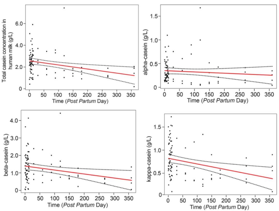 Liao Y等[2]对产后第一年母乳中(88份样品)的总酪蛋白、α-酪蛋白、β-酪蛋白和κ-酪蛋白进行了定量分析。研究结果显示,α-酪蛋白含量为0.04~1.68 g/L、β-酪蛋白含量为0.04~4.42 g/L、κ-酪蛋白含量为0.10~1.72 g/L。线性回归分析显示,总酪蛋白、β-酪蛋白和κ-酪蛋白含量随泌乳时间的延长呈逐渐下降趋势(图2)。