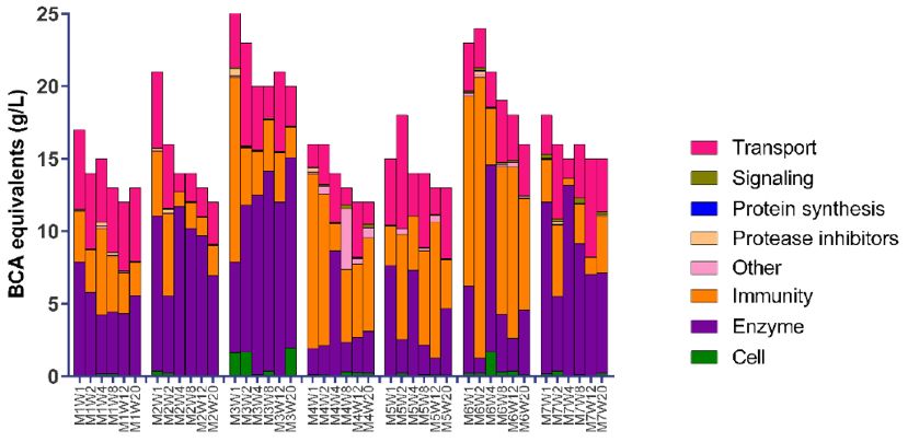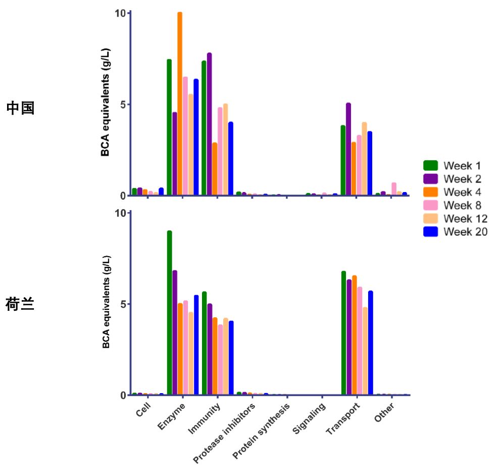 Elwakiel M[4]等采集了7位中国母亲产后第1-20周和4位荷兰母亲产后第1-24周的乳汁样本,应用基于强度的绝对定量(Intensity-based absolute quantification, iBAQ)技术对人乳清中不同生物活性的蛋白进行了定性和定量分析。该项由伊利支持的研究发现,中国和荷兰的人乳中乳清蛋白含量随泌乳时间的延长呈逐渐下降趋势。初乳和成熟乳中乳清蛋白成分差异较大,但是,二者均以免疫蛋白、酶类和运输蛋白为主(图4),这三类蛋白中的15种主要蛋白含量在乳清蛋白中占95%以上。中国和荷兰母亲不同泌乳时期的乳清蛋白组成和含量显示出一定的相似性(图5)。免疫相关蛋白含量随泌乳时间的延长呈下降趋势:免疫相关蛋白在泌乳早期含量较高和新生儿免疫系统不完善相关。