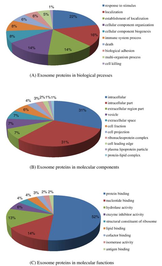 外泌体(Exosome)是细胞分泌的纳米级(40-100nm)囊泡,内部包裹了蛋白质、mRNA和microRNA等物质。外泌体天然存在于体液中,包括羊水、血液、人乳和牛乳等,而不同组织来源的外泌体在内容物组成和功能方面存在差异。杨梅等[6]通过使用iTRAQ和最新的分析技术,对中国的人乳和牛乳中的外泌体蛋白进行了定性和定量分析。该研究一共分析了920种外泌体蛋白,其中575种蛋白在不同泌乳时期的人乳和牛乳中的表达具有差异 (P<0.05)。这575种差异表达蛋白根据GO功能注释归类为生物过程蛋白(Exosome proteins in biological processes)、分子成分蛋白(Exosome proteins in molecular components)和分子功能蛋白(Exosome proteins in molecular functions)。